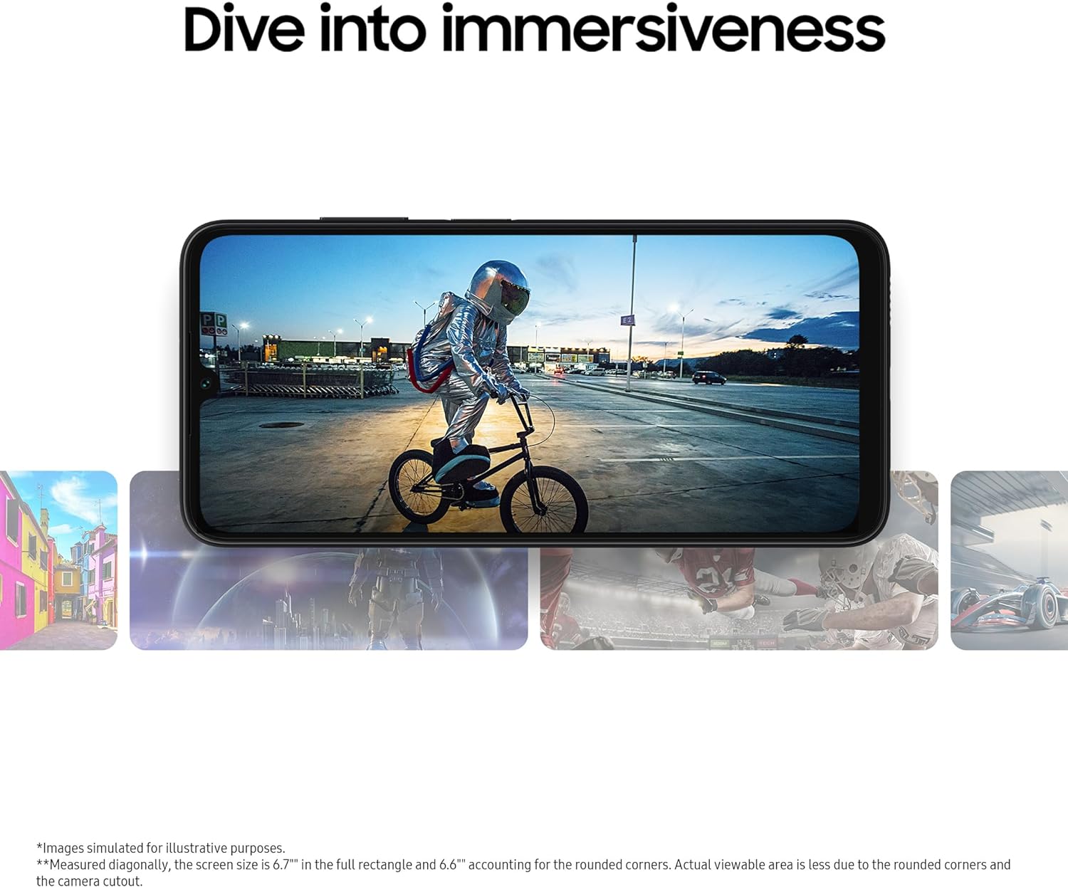 Measured diagonally, the screen size is 6.7″ in the full rectangle and 6.6″ accounting for the rounded corners. Actual viewable area is less due to the rounded corners and the camera cut-out.