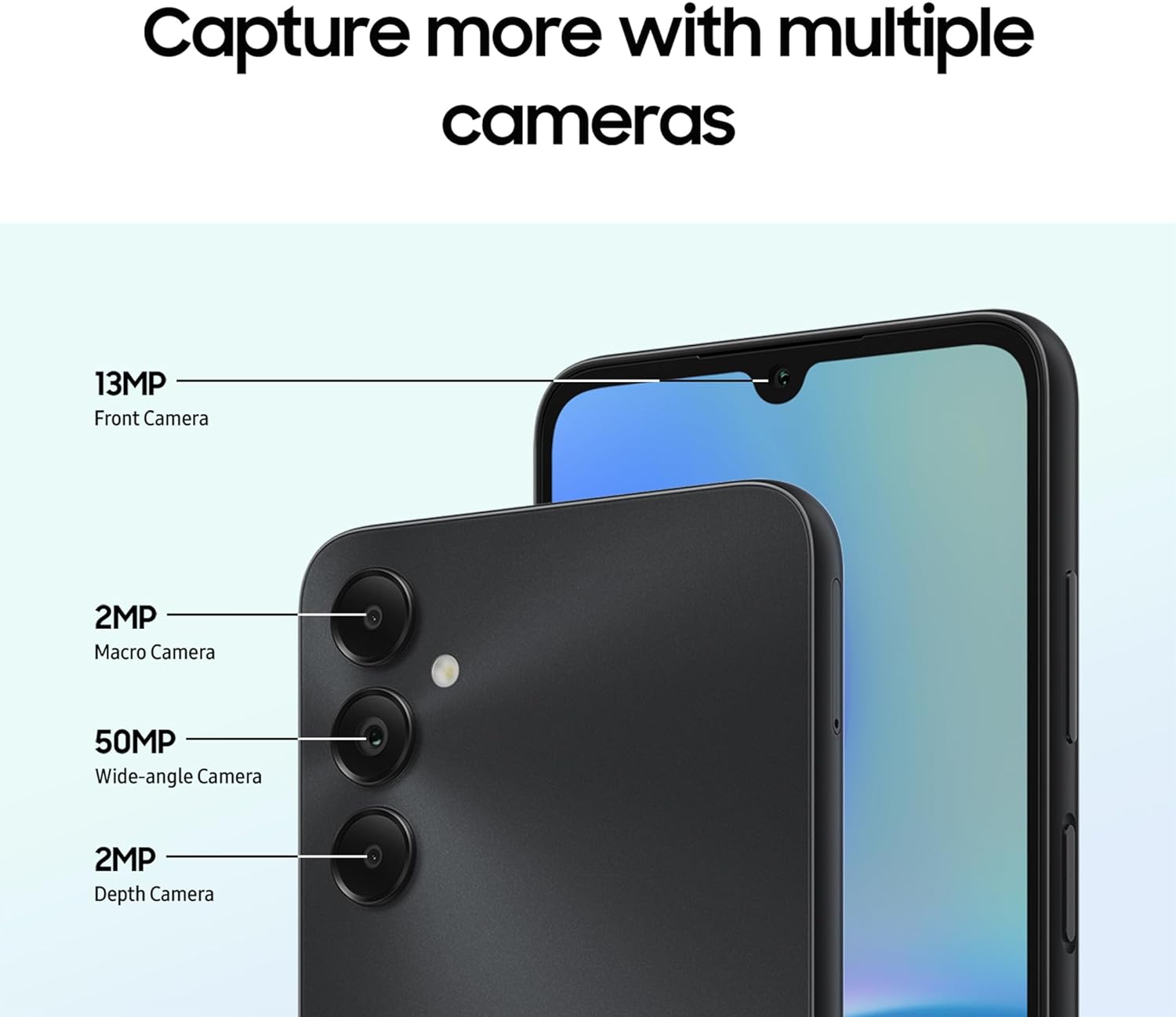The front and back of the Galaxy A05s are shown to showcase its four multiple cameras including the 13MP Front Camera, the 2MP Macro Camera, the 50MP Wide-angle Camera and the 2MP Depth Camera.